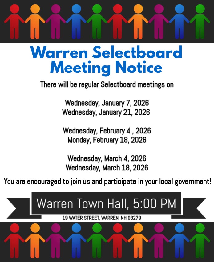 Join us at these upcoming regular Selectboard meetings! All are welcome to attend. Meetings begin at 5:00 PM at the Warren Town Hall.