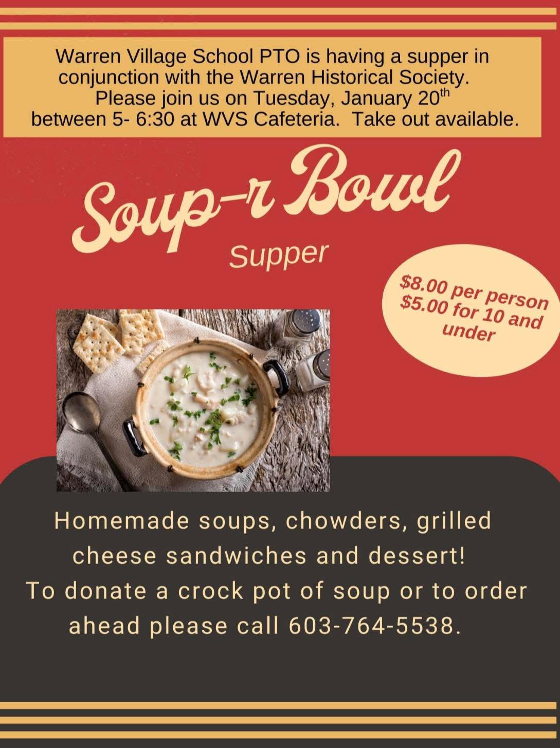 Warren Village School PTO is having a supper in conjunction with the Warren Historical Society. Join them on Tuesday, January 20 between 5 and 6:30 at the Warren Village School cafeteria. Take out is available. $8 per person. $5 for kids under 10.