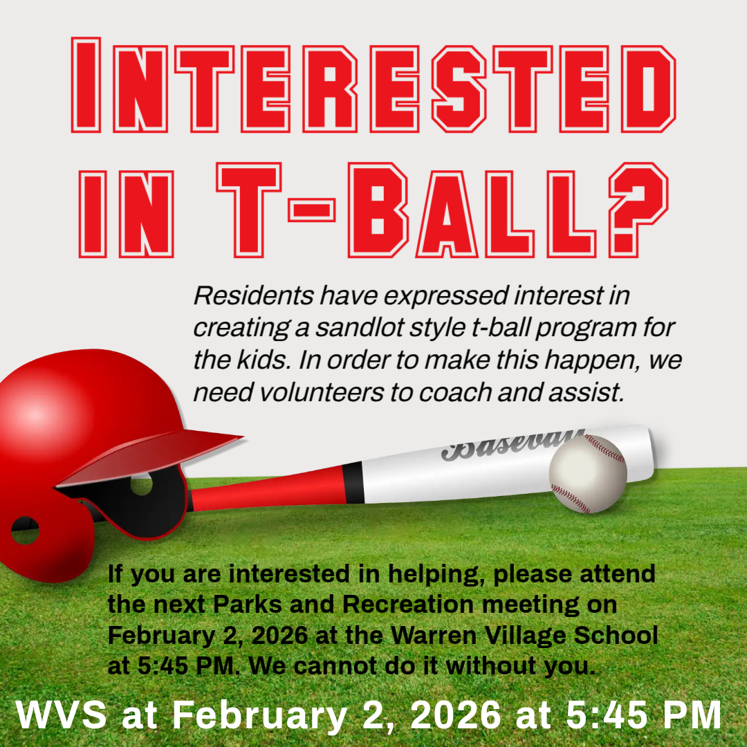 Make a difference in your community! Join us at the next Parks and Recreation meeting! We will meet on February 2 at 5:45 PM at the Warren Village School! Now is a great time to join as volunteers are planning activities for 2026! There will be discussions about the upcoming Winter Festival (February 14) and whether there are volunteers to organize t-ball in 2026. Look forward to seeing you there!