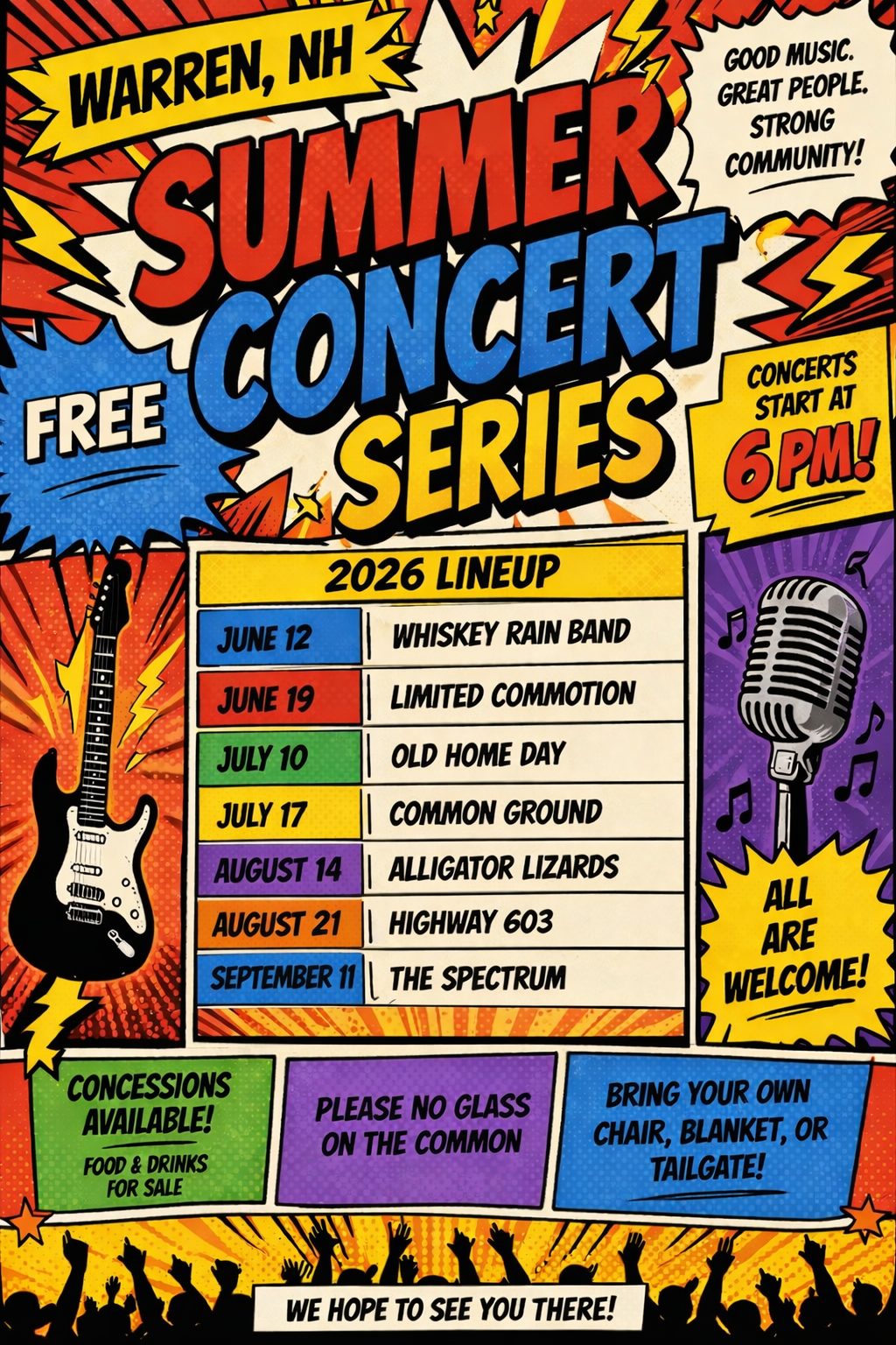 Join us on the Common this summer for live music, community connection, and a chance to catch up with neighbors and friends while enjoying a great Friday evening outdoors. Concerts begin at 6 PM. Concessions will be available for sale and vendors vary by concert. Bring your chair, blanket, or tailgate. Friendly dogs are welcome. Please, no glass on the Common.